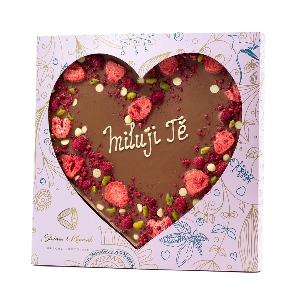 Naše mléčná čokoláda je vyhlášená. Provoní vám interiér, naladí vaše smysly a na jazyku se jen rozplývá. Vytvořit z ní velký symbol lásky byla snadná volba a spojením s lyofilizovaným posypem se dotvořilo romantické vyznání z mléčné čokolády.