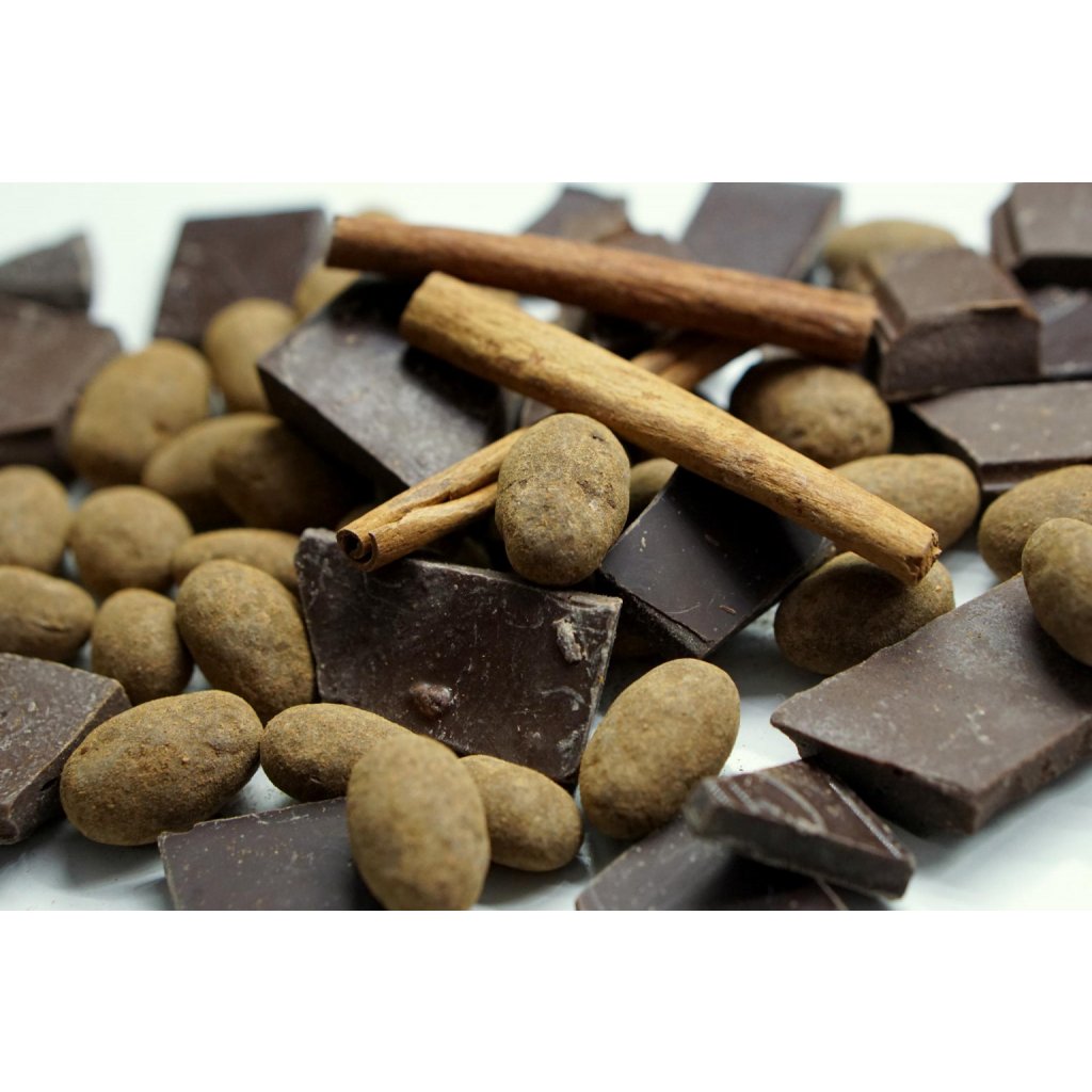 Mléčná čokoláda (min. 70 %): obsah kakaové sušiny nejméně 35 % (cukr, kakaové máslo, sušené plnotučné mléko, kakaové boby, emulgátor: slunečnicový lecitin, aroma: přírodní vanilka), mandle pražené – jádra (min. 17 %), skořice cejlonská (min. 0,7 %). Může obsahovat suché skořápkové plody. Uchovávejte v chladu a suchu. Vyrobeno ručně v České republice.