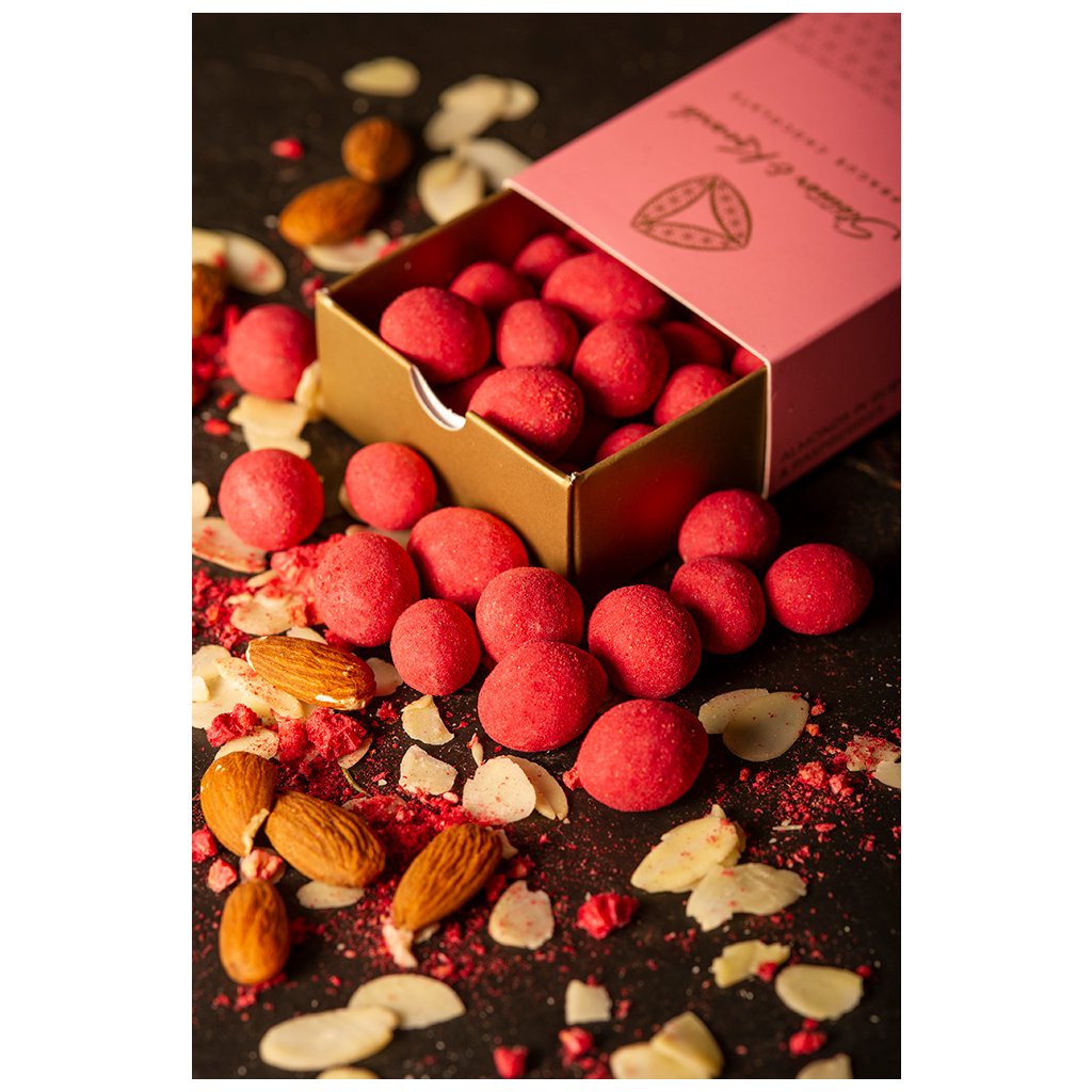 Mandle v ruby čokoládě a malinovém prášku 130g