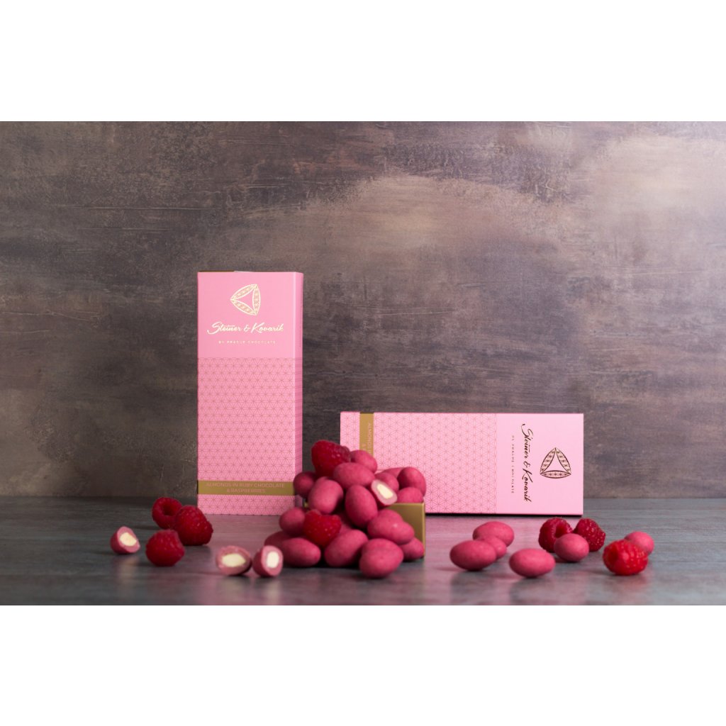 Ruby čokoláda s přirozenou ovocnou chutí a rubínovou barvou vyniká se španělskými mandlemi a malinovým práškem. Lahodná, svěží a elegantní kombinace, která potěší chuť i oko.