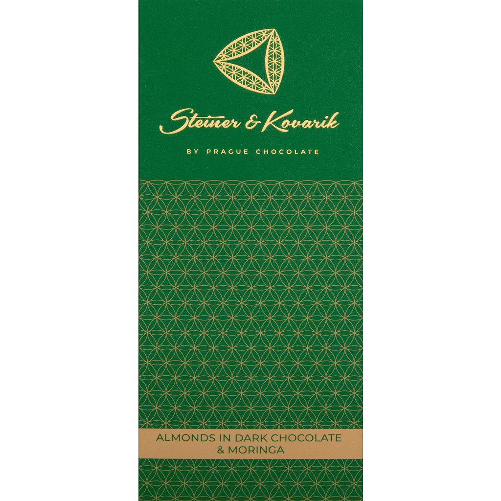 Čokoláda hořká (min. 70 %): obsah kakaové sušiny min. 55 % (cukr, kakaové boby, kakaové máslo, emulgátor: slunečnicový lecitin, aroma: přírodní vanilka), mandle pražené — jádra (min. 17 %), moringa — prášek z listu (min. 0,7 %). Může obsahovat mléko. Uchovejte v chladu a suchu. Vyrobeno ručně v České republice.