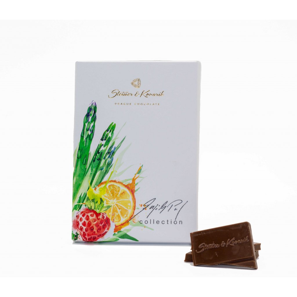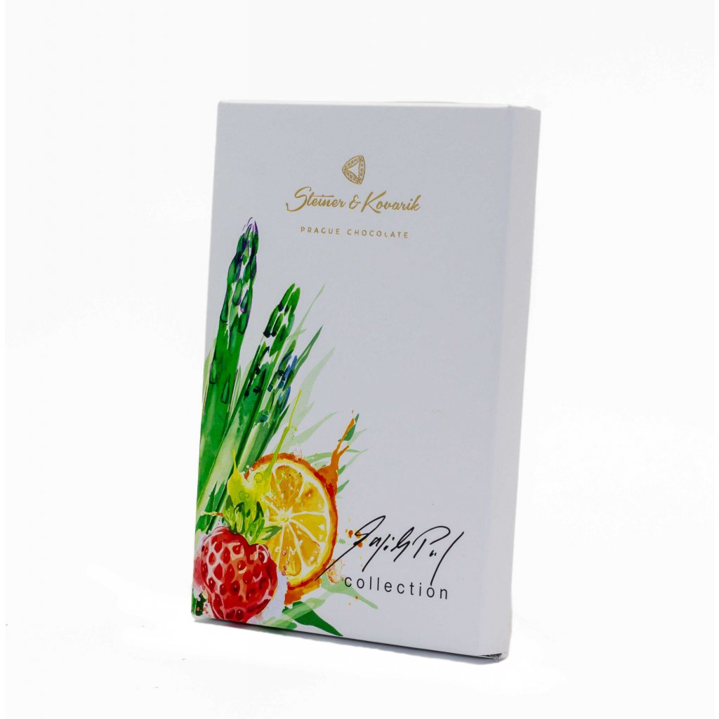 “Propojil jsem své kulinářské umění se čokoládou Steiner & Kovarik a společně vám představujeme bílou čokoládu s chřestem, jahodami a estragonem, doplněnou černým rybízem a grenadinou. Inspirací mi byl můj úspěšný desert – tartaletka s jahodami a chřestem.