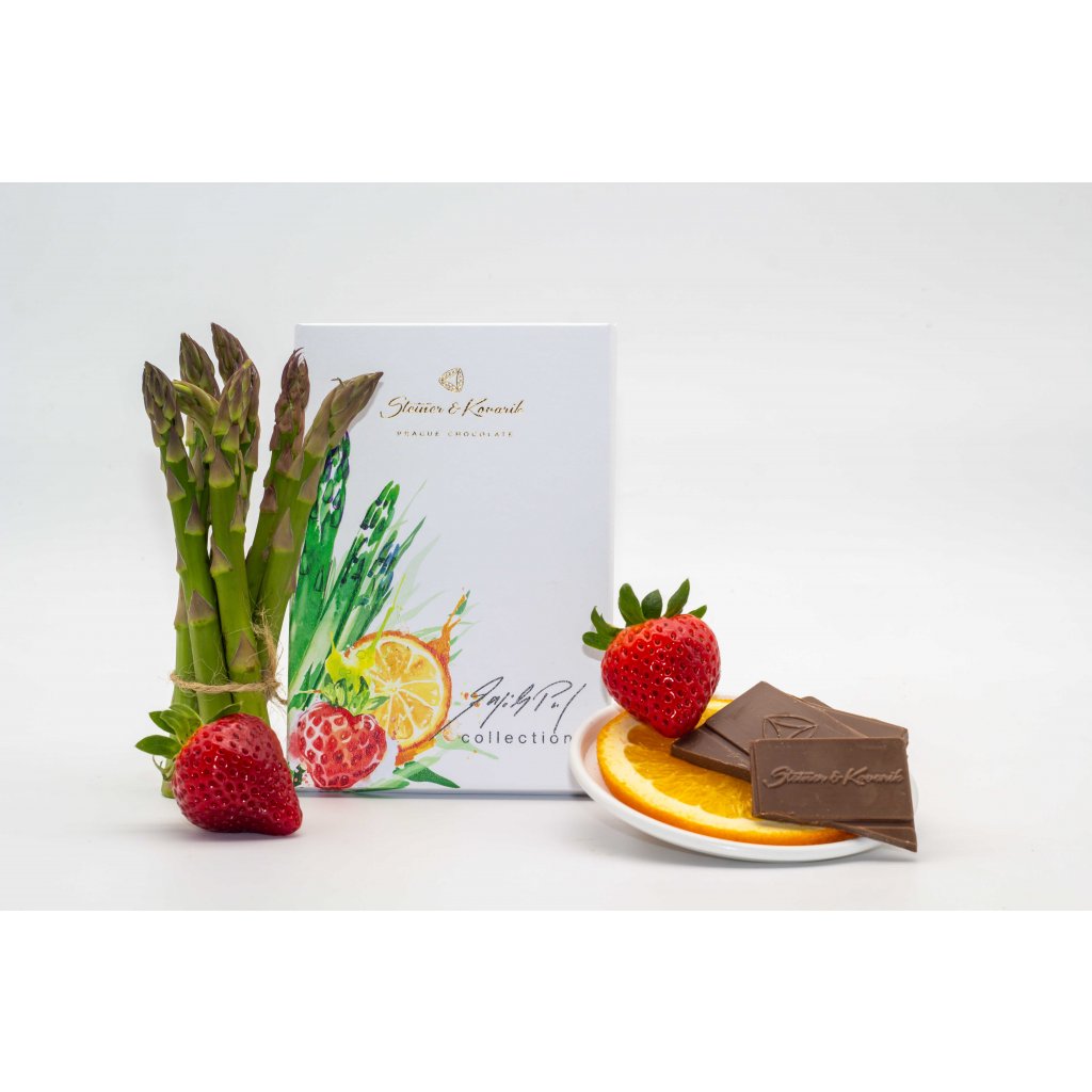 Chřest, na němž jsem recepturu postavil, je velmi překvapivou ingrediencí. Jeho svěžest a lehká pikantnost tvoří základ této neotřelé chuťové kombinace. Ovocná chuť lyofilizovaných jahod a černého rybízu dodává čokoládě příjemný nakyslý nádech a v kombinaci s chutí grenadiny působí exoticky. Estragon a červený pomeranč podtrhává a vyvažuje celkovou recepturu.