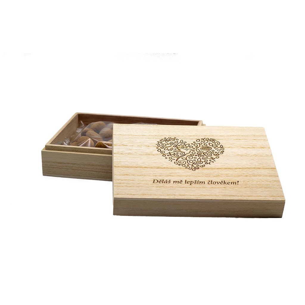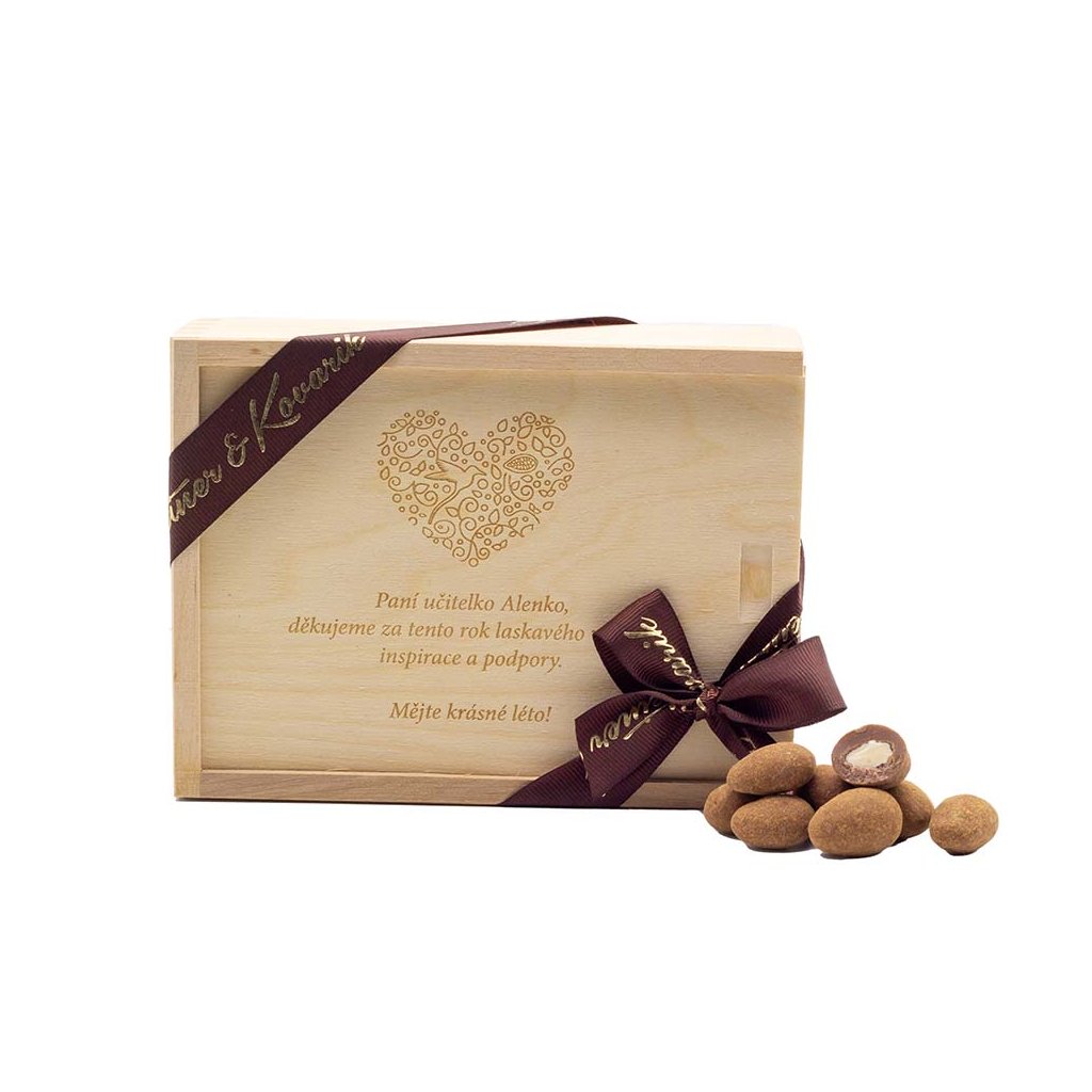 Hledáte opravdu osobní a sladký dárek? Vygravírujeme vám do dřevěné krabičky osobní vzkaz a jednoduchý obrázek nebo firemní logo. Je jen na vaší fantazii jak potěšíte ty co jsou vám nejdražší. V krabičce pak najdou naše nejoblíbenější mandle v ruby čokoládě obalené v malinovém prachu a mandle v mléčné čokoládě se skořicí. Věnujete nejosobnější čokoládu.