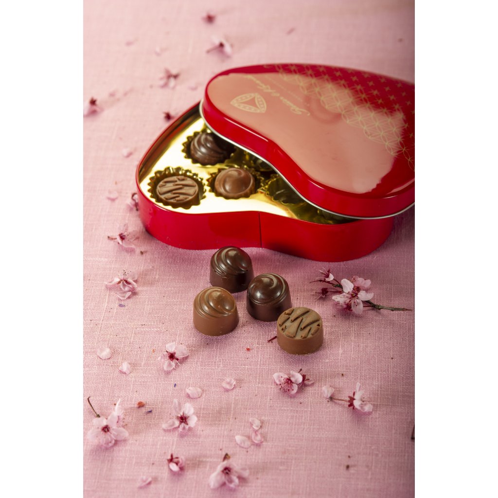 Srdce plné lahodných, ručně vyráběných pralinek z klasických českých ingrediencí a výběrové čokolády Steiner & Kovarik. V krásné plechové dóze ve tvaru srdce na vás čeká pět druhů lahodných ručně dělaných pralinek - švestky macerované v Tuzemáku v mléčné čokoládě, nugát z piemontských oříšků v hořké čokoládě, pistáciový marcipán v mléčné čokoládě, mangová náplň v hořké čokoládě a malinová náplň v mléčné čokoládě.