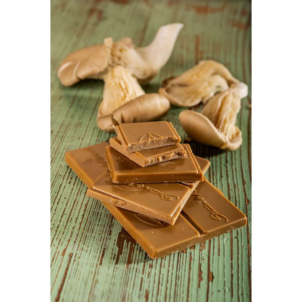 U bílé bean to bar čokolády s hlívou jsme využili kakaové máslo, výborný nosič prospěšných látek, a spojili ho s blahodárnou hlívou ústřičnou. Pár kapek velmi kvalitního BIO esenciálního pomerančového oleje jí dodává příjemný svěží nádech.