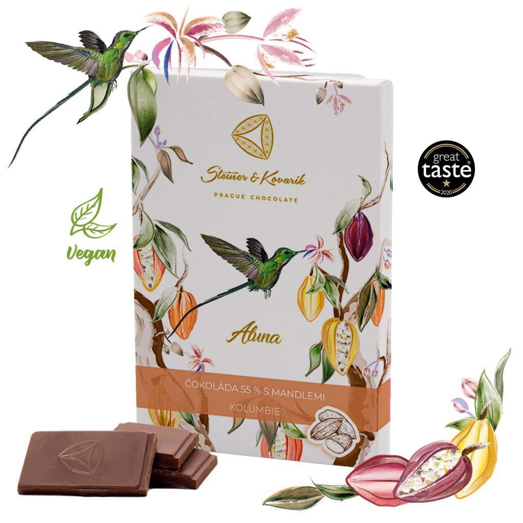 Kakaové máslo, kokosový cukr, kakaové boby, mandle 12 %. Obsah kakaových součástí nejméně 55 %. Může obsahovat mléko, arašídy a suché skořápkové plody. Uchovávejte v chladu a suchu. Produkt kontrolovaného zemědělství. Vyrobeno ručně v České republice.