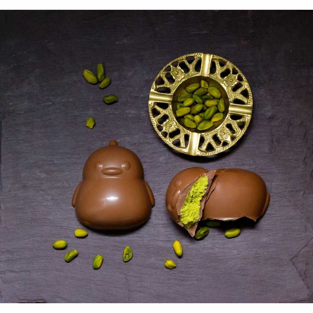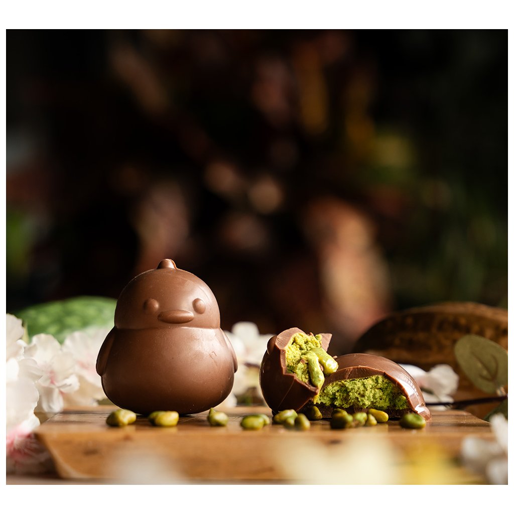 Roztomilé čokoládové kuřátko z jemné mléčné čokolády ukrývá lahodný krém z pistácií a bílé čokolády. Radost v každém soustu – ideální dárek do velikonočního košíčku!