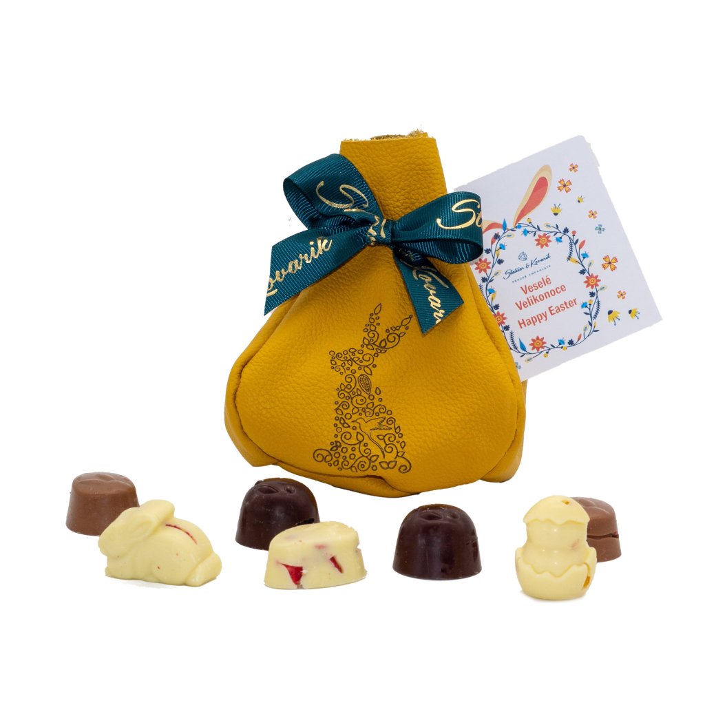 Roztomilý velikonoční měšec se zajíčkem plný čokoládových figurek z mléčné, bílé i hořké čokolády, ozdobených lyofilizovaným ovocem. Sladká radost pro malé koledníky i rodiče! 🍫🐇