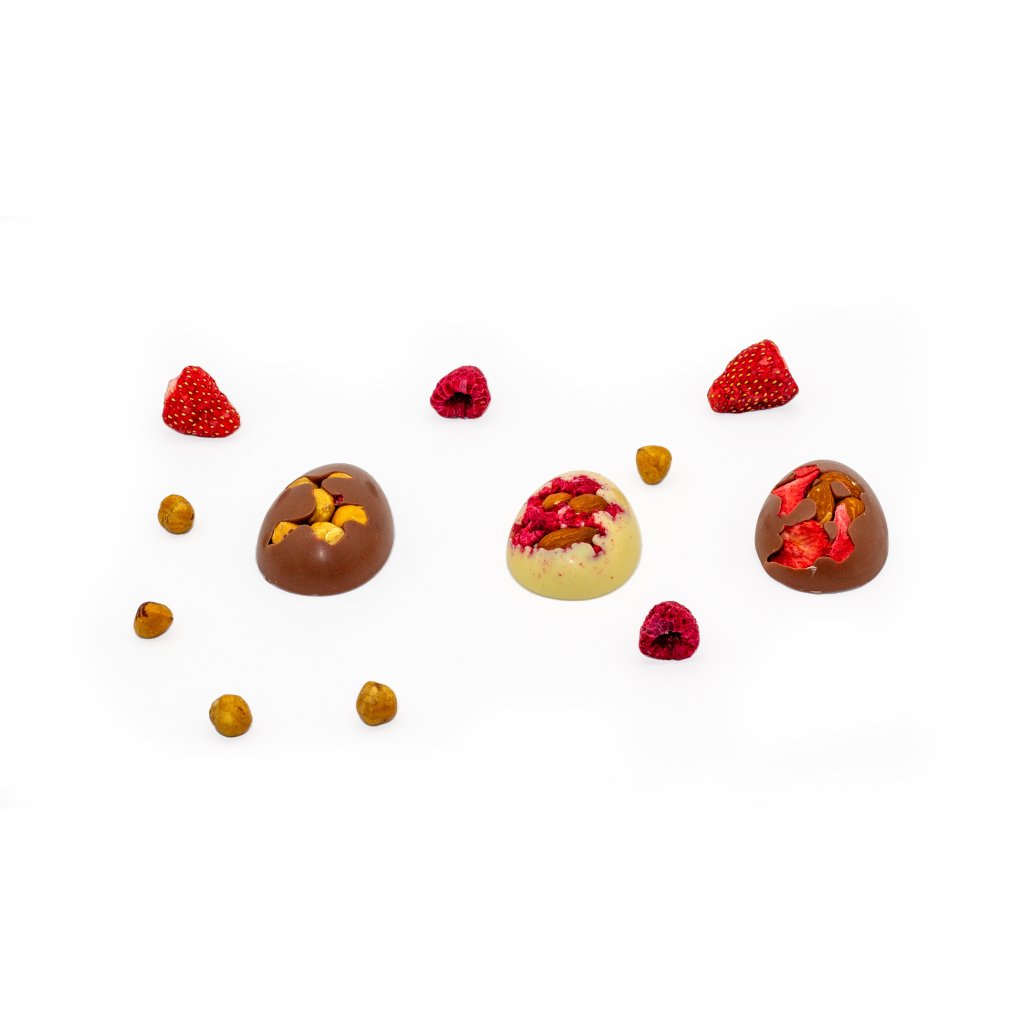 Roztomilé tradiční vajíčko, vyrobené ručně z naší nejlepší čokolády a s láskou naplněné výběrovými španělskými mandlemi a lyofilizovanými malinami.