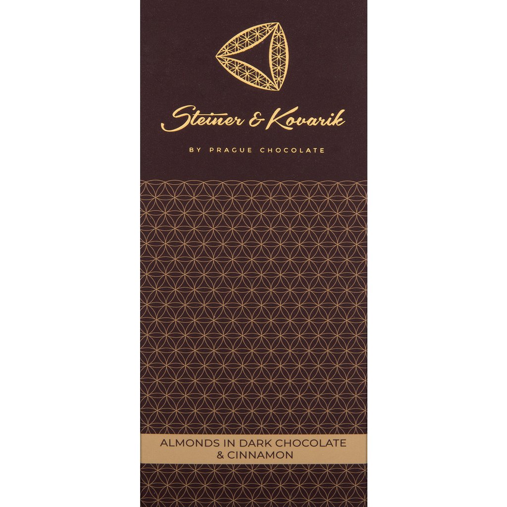 dark chocolate (min. 70 %): cocoa solids content at least 55 % (sugar, cocoa beans, cocoa butter, emulsifier: sunflower lecithin, aroma: natural vanilla), roasted almonds (min. 17 %), Ceylon cinnamon (min. 0, 7 %). May contain milk, soy, peanuts, and nuts. Store in a cool, dry place. Made in Czech Republic.