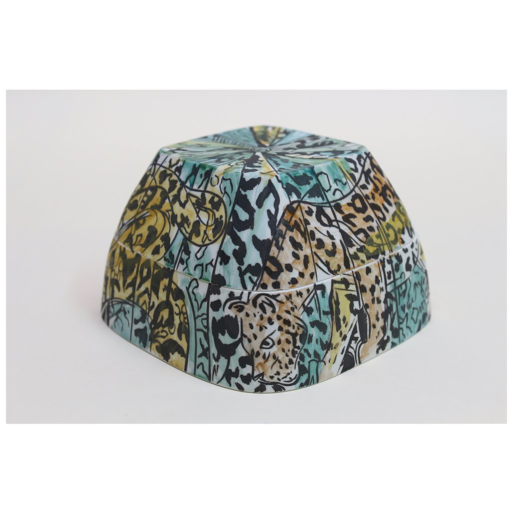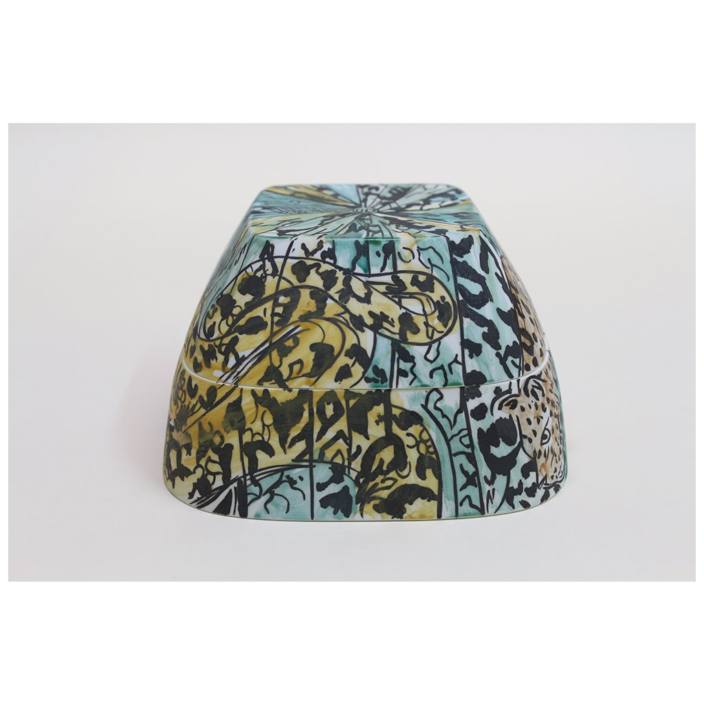 Technique: The biscuit tin is rendered with a so-called heat transfer paint and colored with metal chlorides - salts. This was followed by firing at 1400 ˚C. The final color effect is achieved with surface colors at 820 ˚C in a natural scale corresponding to the colors of the jungle and cocoa fruit - green, ocher and brown tones. The inside of the jar is glazed by hand. This can has been fired three times.