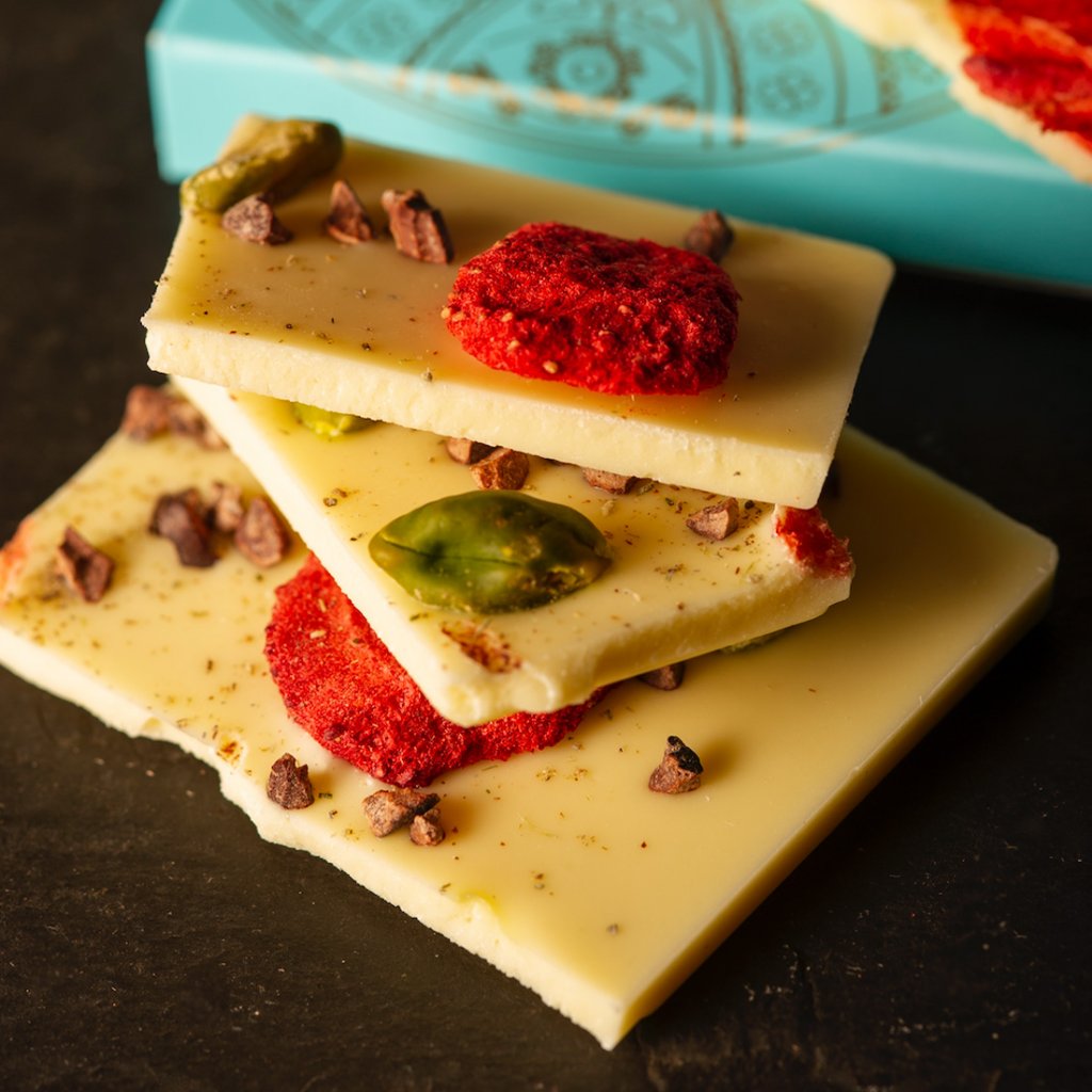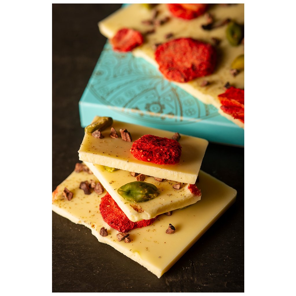 White chocolate: cocoa solids content min. 28 % (sugar, cocoa butter, milk powder, emulsifier: soy lecithin, aroma: natural vanilla), freeze -dried strawberries, pistachios, cocoa beans, lavender flowers. May contain peanuts and nuts.