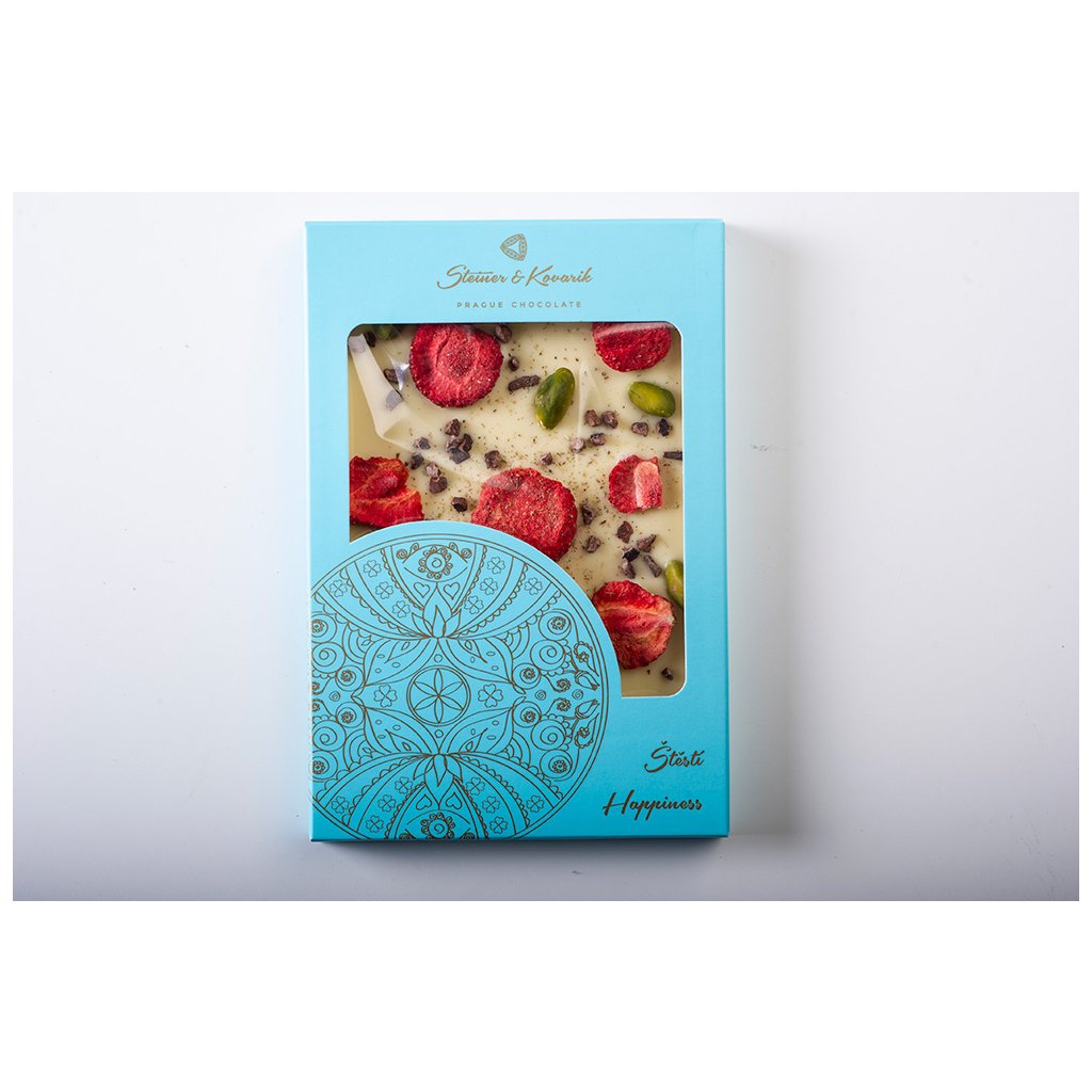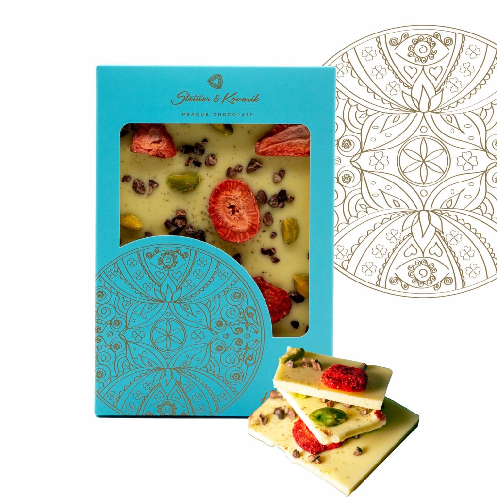 Quality handmade white chocolate sprinkled with lavender flowers, lyophilized strawberries, pistachios and cocoa beans. It is more than just chocolate, because together with it you also give the energy of happiness, which is placed in a box with a hand-painted picture of a mandala. Give happiness.