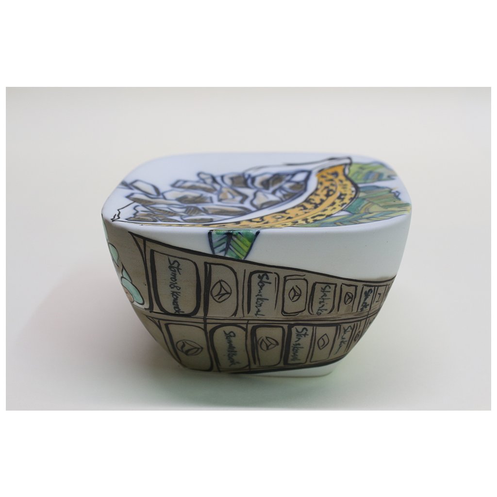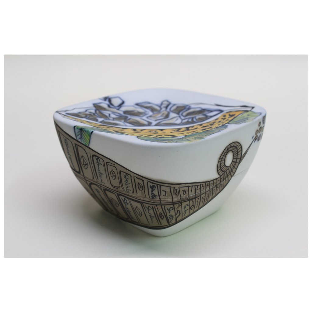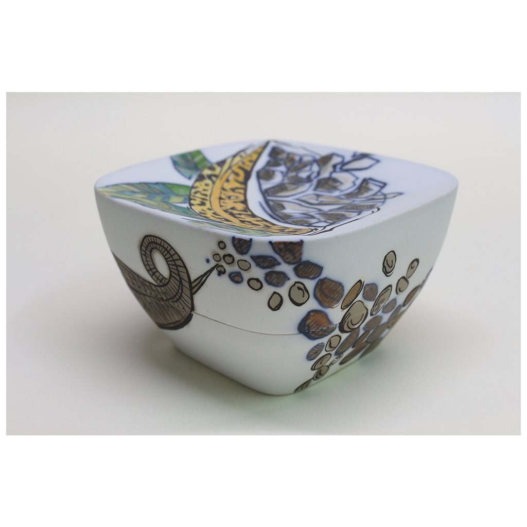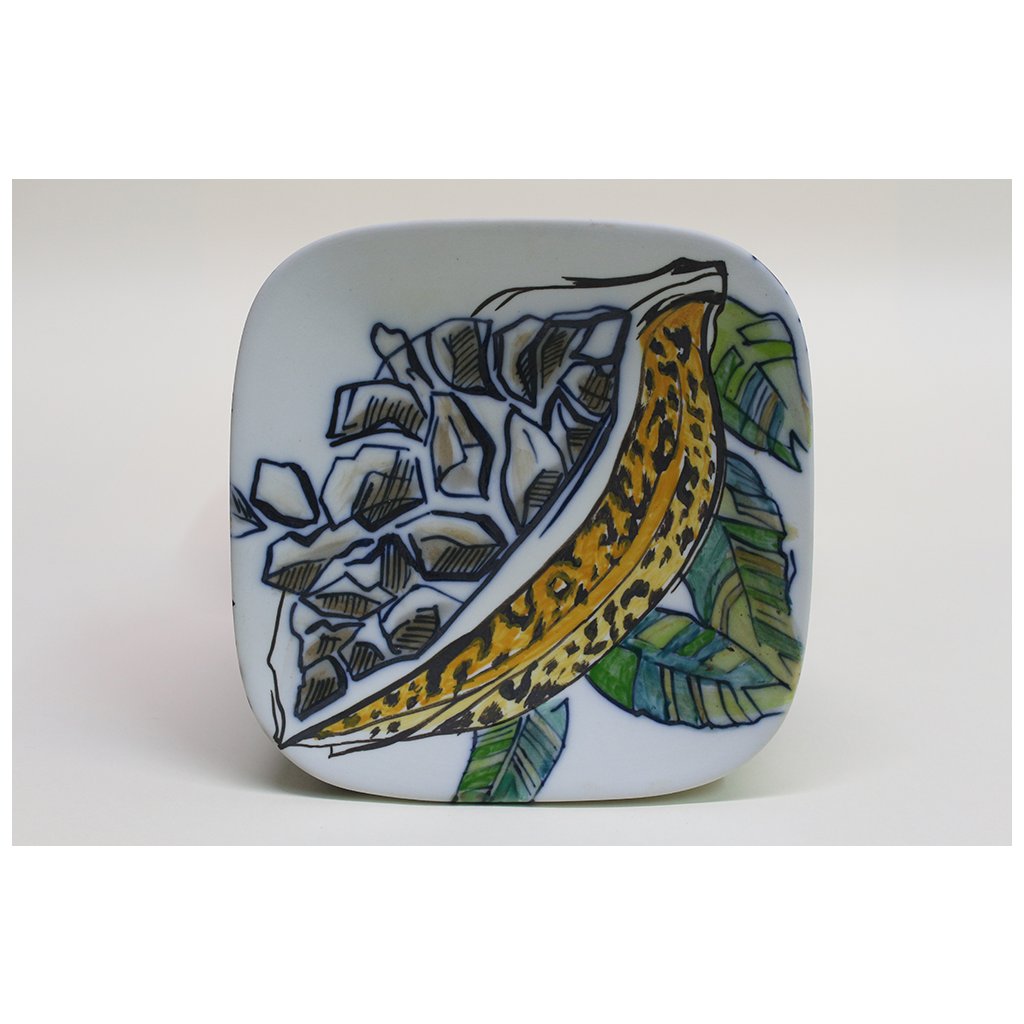 Technique: The can is drawn with a pencil on the so-called overheat (800 ˚C), then the contour is painted with fusible paint and cobalt and colored with metal chlorides - salts. Glazing was followed by firing at 1400˚C. All other tones on this object are so-called surface colors and listers. Burns vary according to shades. Blue, violet and green tones are fired at 820 ˚C, brown, rust and ocher at 780 ˚C, and 750 ˚C is used for red crimson, pink and sometimes light orange tones. All these tones appear in the sum as azure, i.e. transparent, and add up to the underpainting of metal chlorides. This can has been fired four times. In no case is this so-called French porcelain fired only at 1,200˚C.