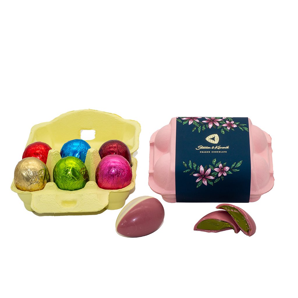 Pink – 1/2 Ruby chocolate with matcha filling, 1/2 White chocolate with raspberry filling