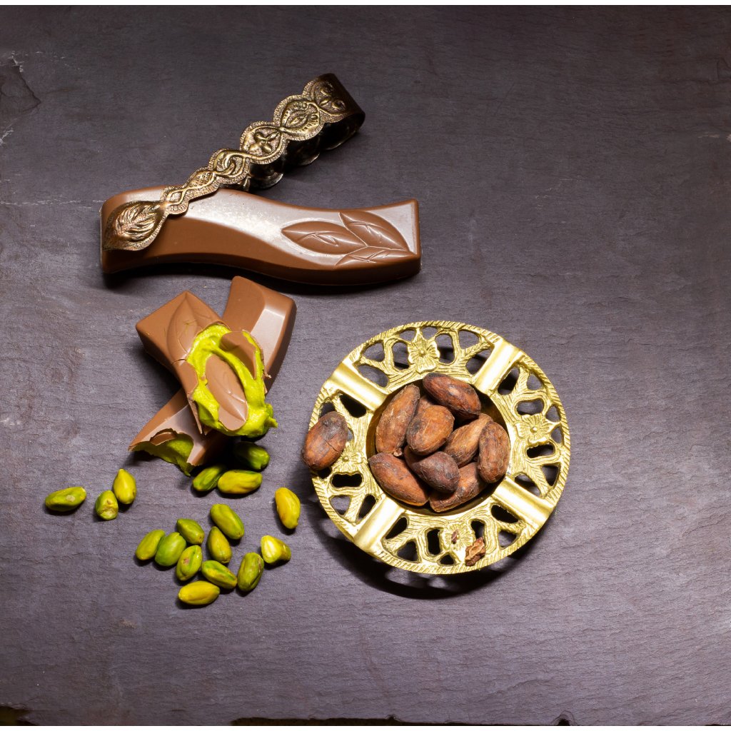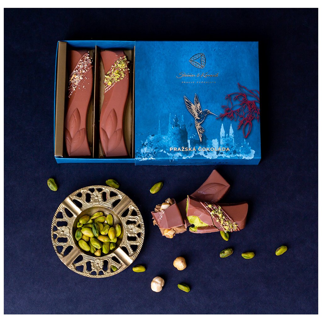 Milk chocolate: cocoa solids content at least 35% (sugar, cocoa butter, milk powder, cocoa beans, emulsifier: sunflower lecithin, flavour: natural vanilla), coconut sugar, cocoa butter, Piemonte hazelnuts, pistachios, white chocolate: Cocoa solids content 28 % or more (sugar, cocoa butter, milk powder, emulsifier: soya lecithin, flavour: natural vanilla), cadayif (wheat flour, water, salt). Store in a cool, dry place. Made by hand in the Czech Republic.