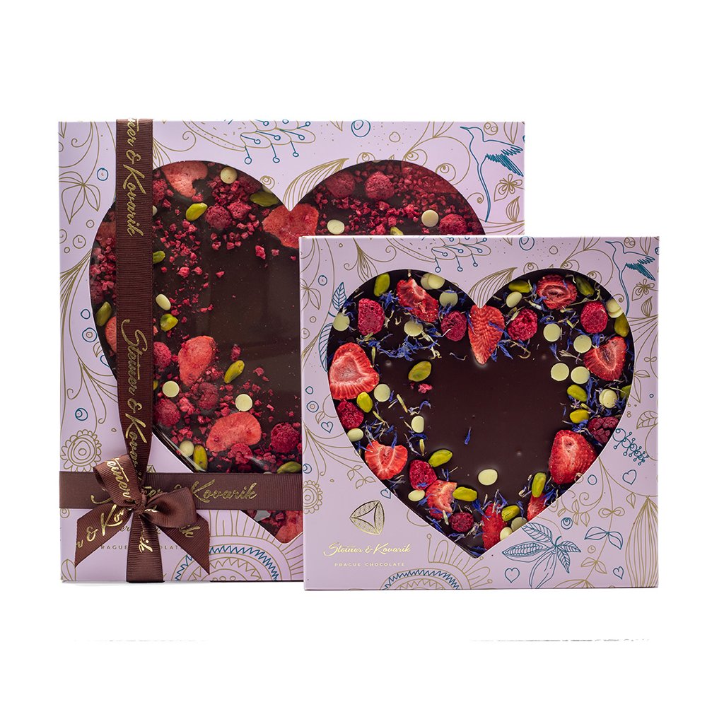 dark chocolate: cocoa solids content of at least 55 % (sugar, cocoa beans, cocoa butter, emulsifier: sunflower lecithin, natural vanilla), white chocolate: cocoa solids content of at least 28 % (sugar, cocoa butter, whole milk powder, emulsifier: soya lecithin, flavouring: natural vanilla), pistachios, freeze-dried strawberries, freeze-dried raspberries, cornflower. Keep cool and dry. Handmade in the Czech Republic.
