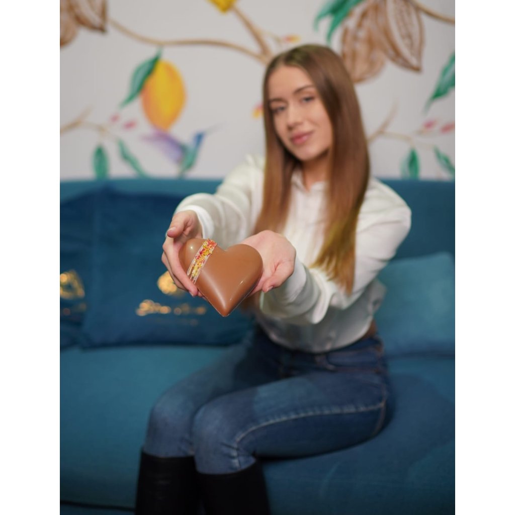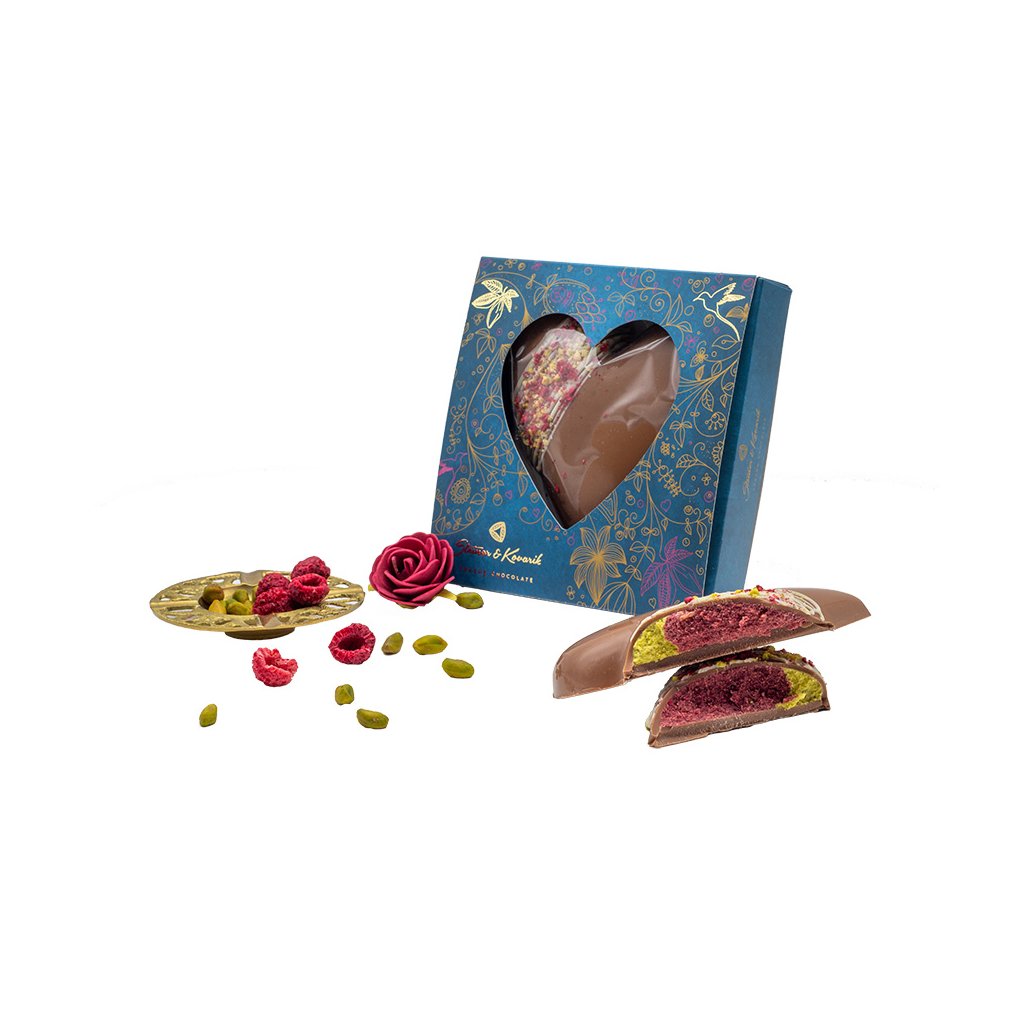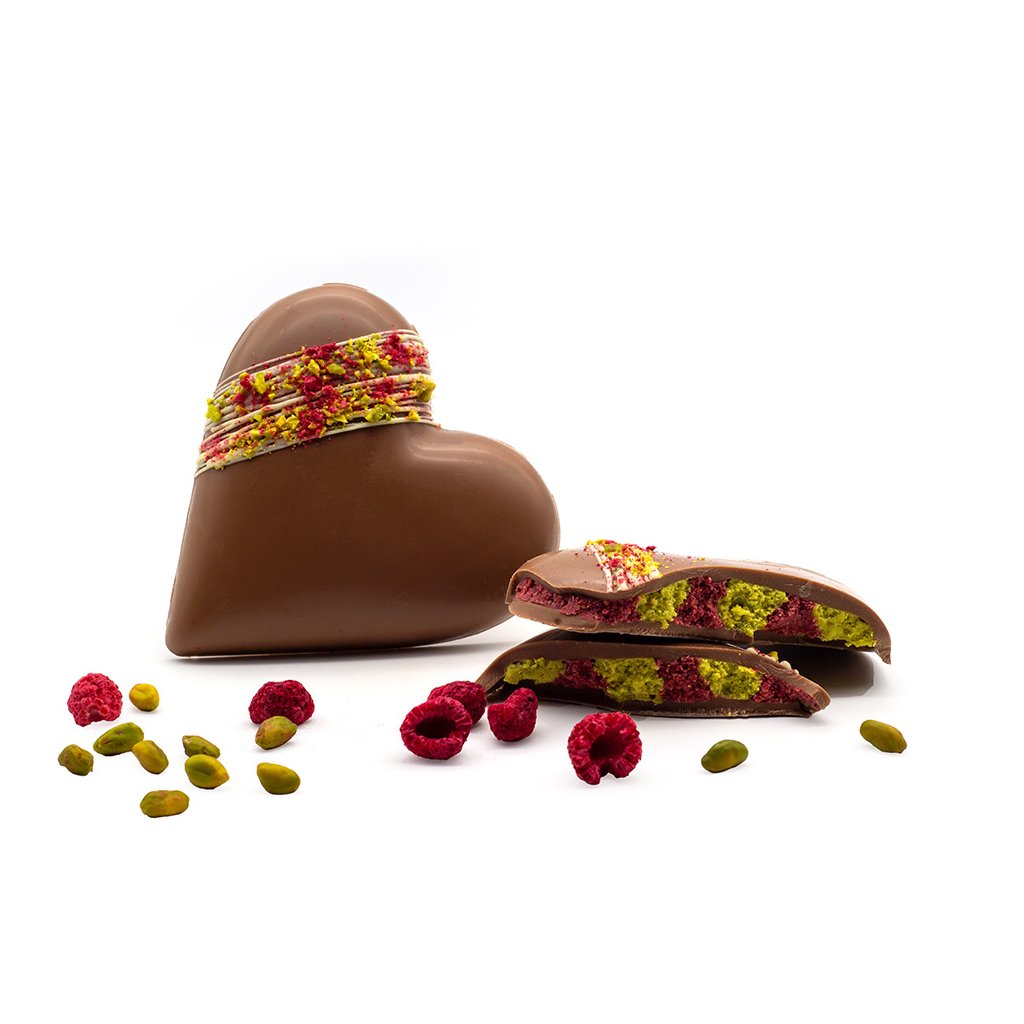 Limited edition milk chocolate heart with raspberry and pistachio filling. A sweet declaration of love that says "I love you" for you. The perfect Valentine's Day gift. ❤️