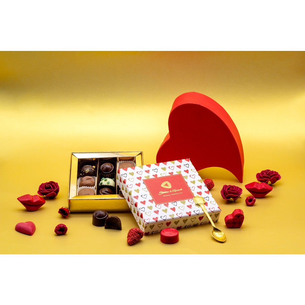 dark chocolate: cocoa solids content at least 55% (sugar, cocoa beans, cocoa butter, emulsifier: sunflower lecithin, aroma: real vanilla), milk chocolate: cocoa solids content at least 35% (sugar, cocoa butter, milk powder, cocoa beans, emulsifier: sunflower lecithin, aroma: natural vanilla), white chocolate: cocoa solids content at least 28% (sugar, cocoa butter, milk powder, emulsifier: soy lecithin, aroma: natural vanilla), almonds, freeze-dried raspberries, coconut sugar, cocoa butter, Piemonte hazelnuts, pistachios, mango puree, glucose syrup, sugar, erythritol, pectin, acidity regulator: citric acid, edible gold, vegetable concentrates (radish, blackcurrant, apple). Store in a cool and dry place. Made by hand in the Czech Republic.