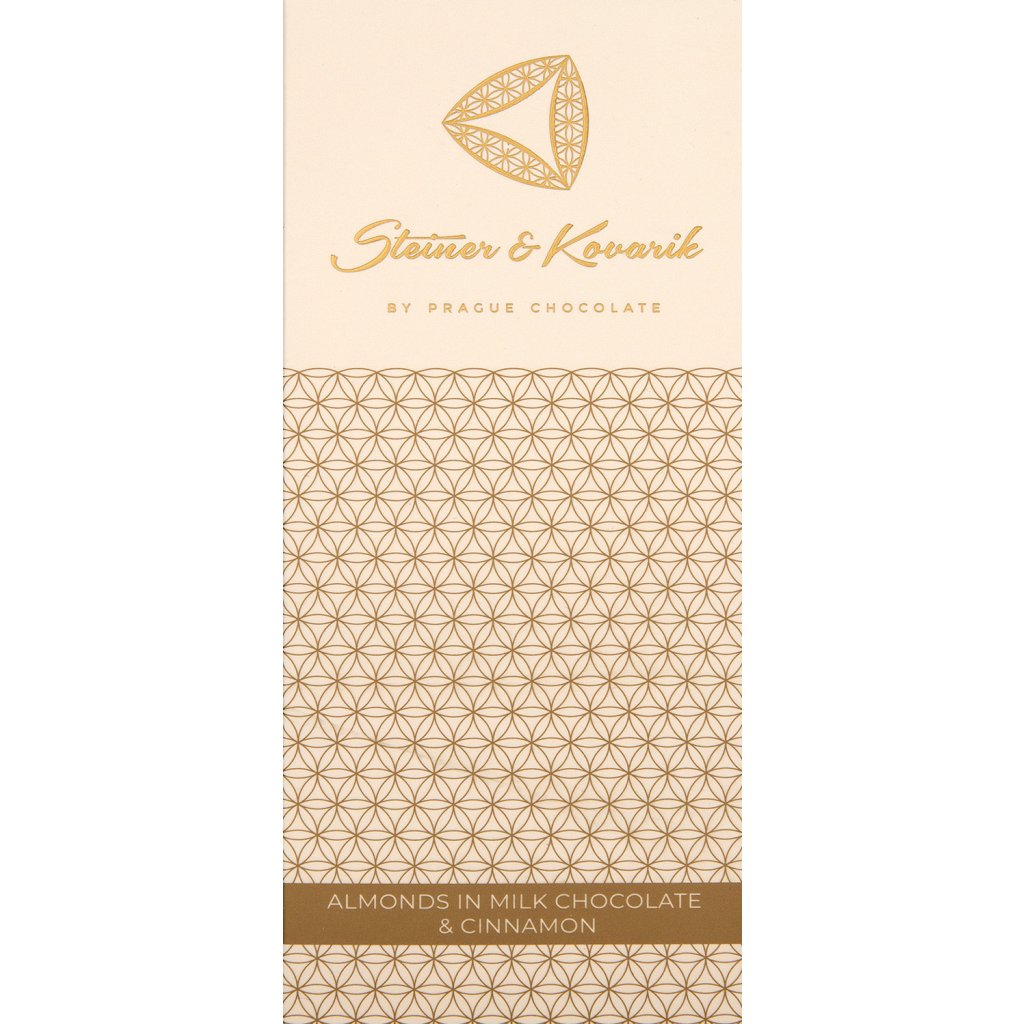 Mléčná čokoláda (min. 70 %): obsah kakaové sušiny nejméně 35 % (cukr, kakaové máslo, sušené plnotučné mléko, kakaové boby, emulgátor: slunečnicový lecitin, aroma: přírodní vanilka), mandle pražené – jádra (min. 17 %), skořice cejlonská (min. 0,7 %). Může obsahovat suché skořápkové plody. Uchovávejte v chladu a suchu. Vyrobeno ručně v České republice.