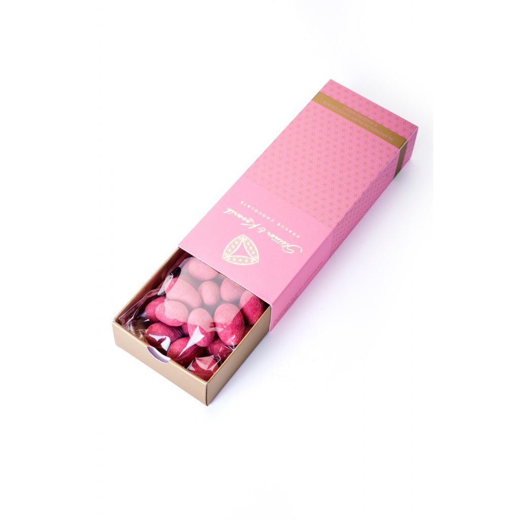 Mandle v ruby čokoládě a malinovém prášku 130g