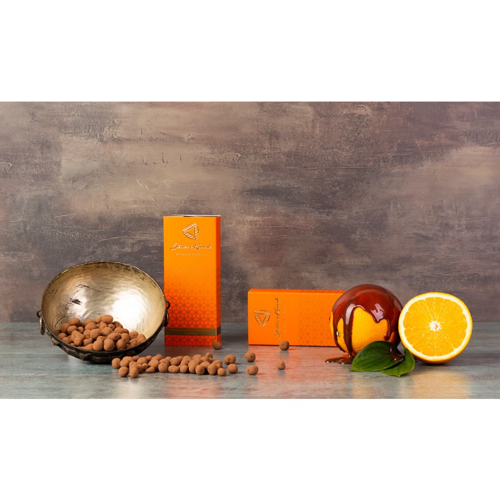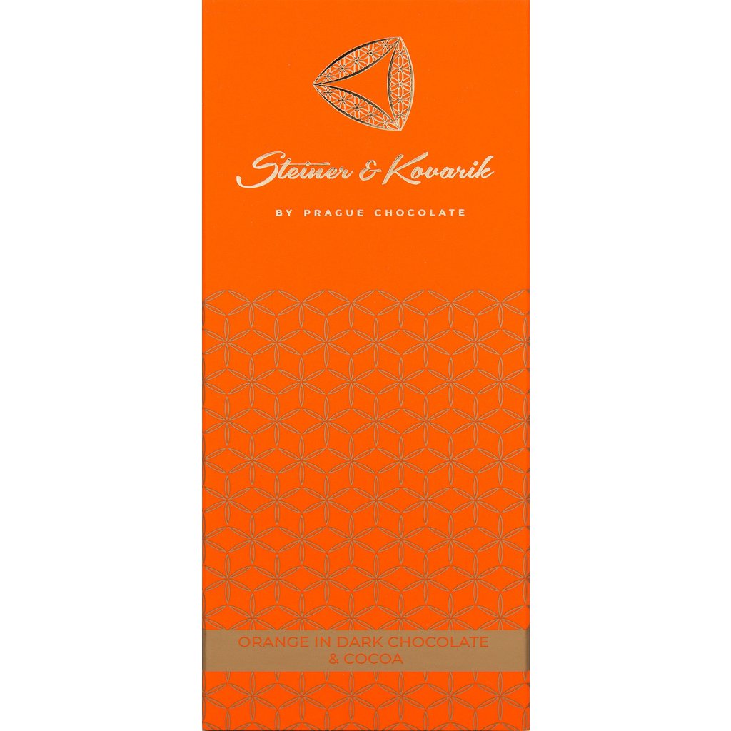 Hořká čokoláda (min. 60 %): obsah kakaové sušiny nejméně 55 % (cukr, kakaové boby, kakaové máslo, emulgátor: slunečnicový lecitin, aroma: pravá vanilka), kousky kandovaného pomeranče: min 25 % (pomeranče, glukózový sirup, cukr), kakaový prášek (min. 1 %). Může obsahovat mléko, arašídy a suché skořápkové plody. Uchovejte v chladu a suchu. Vyrobeno ručně v České republice.