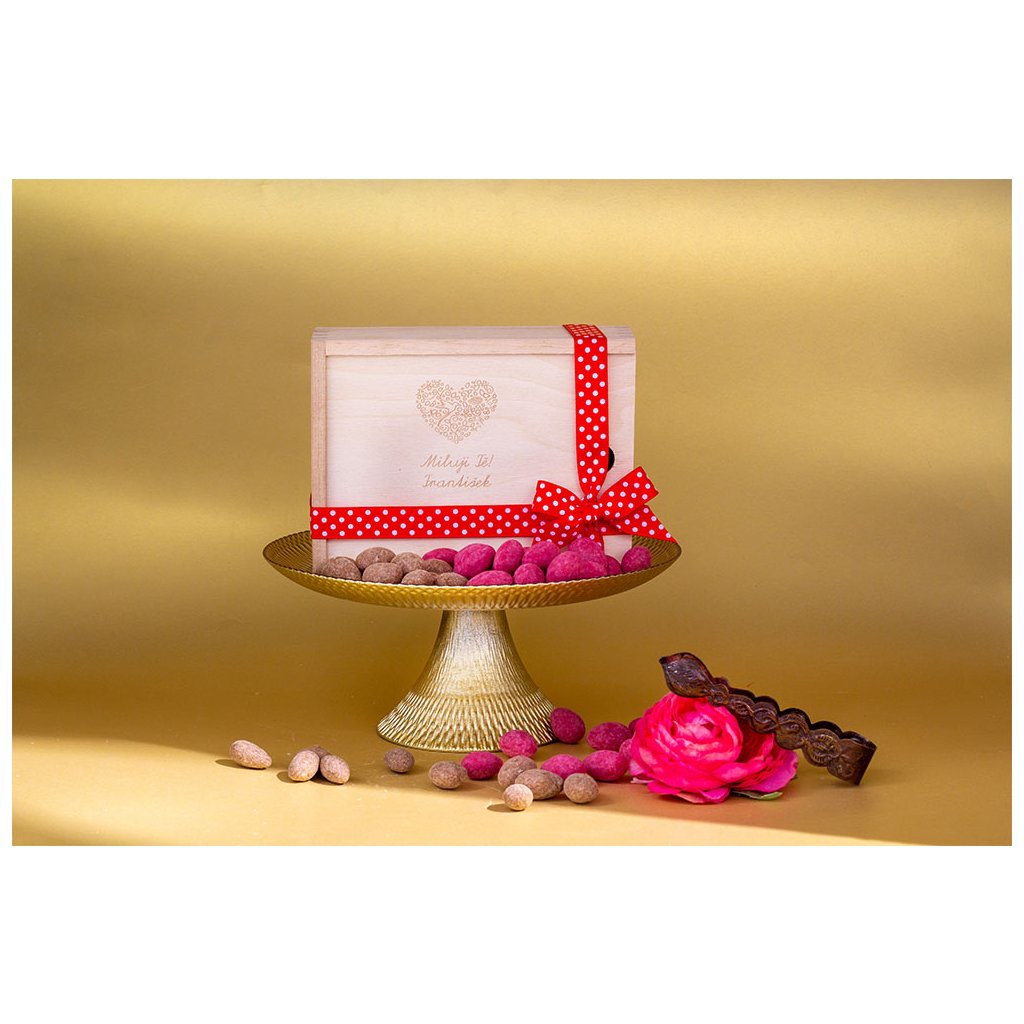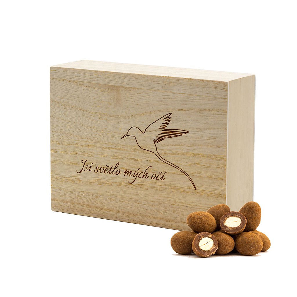 Hledáte opravdu osobní a sladký dárek? Vygravírujeme vám do dřevěné krabičky osobní vzkaz a jednoduchý obrázek nebo firemní logo. Je jen na vaší fantazii jak potěšíte ty co jsou vám nejdražší. V krabičce pak najdou naše nejoblíbenější mandle v ruby čokoládě obalené v malinovém prachu a mandle v mléčné čokoládě se skořicí. Věnujete nejosobnější čokoládu.
