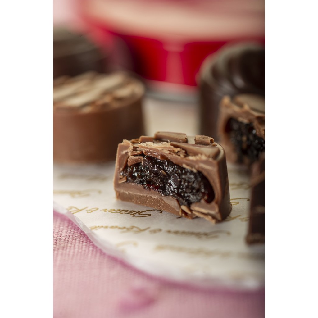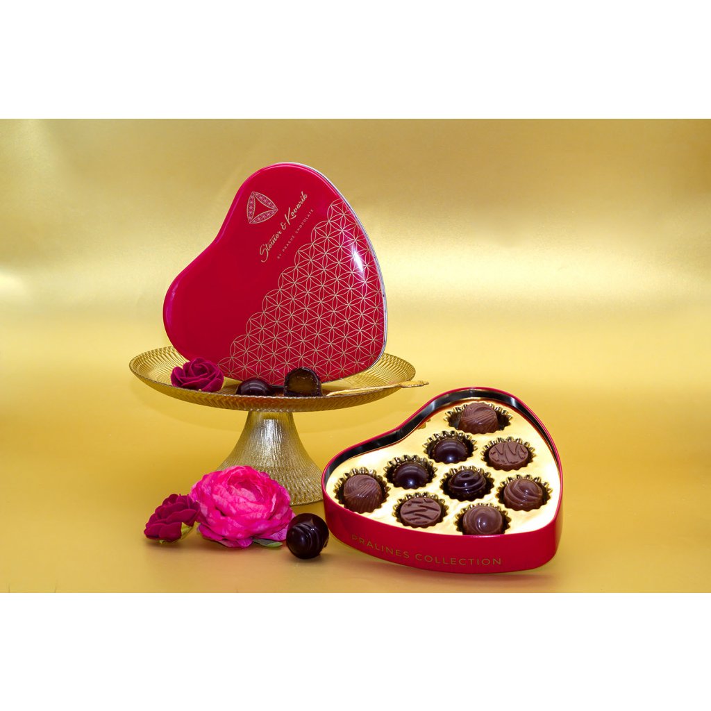 Srdce plné lahodných, ručně vyráběných pralinek z klasických českých ingrediencí a výběrové čokolády Steiner & Kovarik. V krásné plechové dóze ve tvaru srdce na vás čeká pět druhů lahodných ručně dělaných pralinek - švestky macerované v Tuzemáku v mléčné čokoládě, nugát z piemontských oříšků v hořké čokoládě, pistáciový marcipán v mléčné čokoládě, mangová náplň v hořké čokoládě a malinová náplň v mléčné čokoládě.
