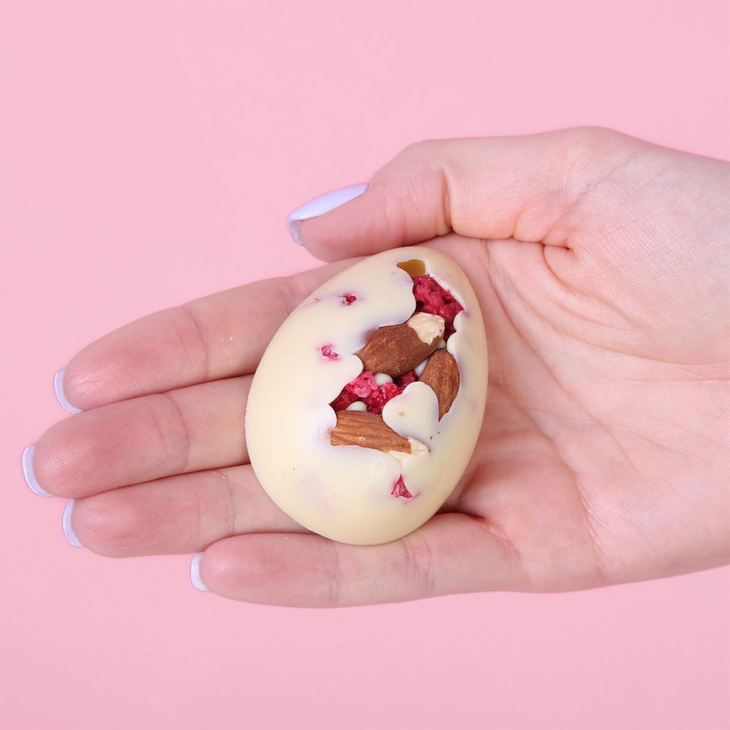 Roztomilé tradiční vajíčko, vyrobené ručně z naší nejlepší čokolády a s láskou naplněné výběrovými španělskými mandlemi a lyofilizovanými malinami.