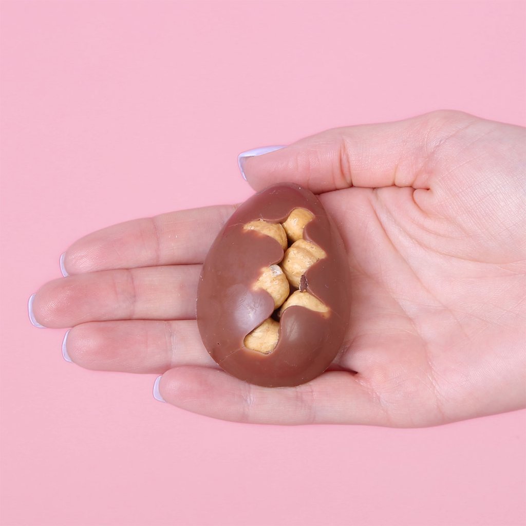 Roztomilé tradiční vajíčko, vyrobené ručně z naší nejlepší mléčné čokolády a s láskou naplněné výběrovými lískovými oříšky Piemonte.
